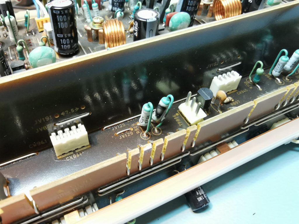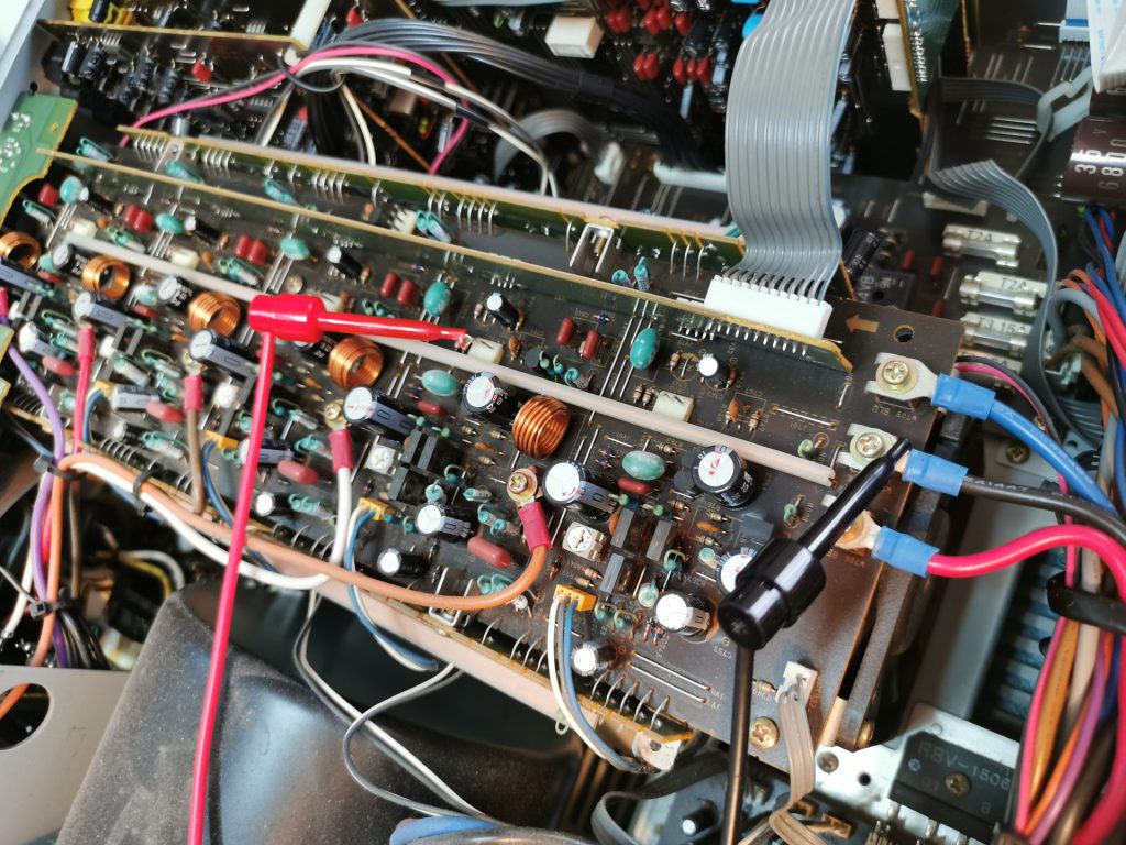 Natürlich sind auch ein paar andere Bauteile in dem betroffenen Kanal mitgestorben. Ein paar Dioden sowie Widerstände müssen erneuert werden – die Vorstufentransistoren selbst haben aber keinen Schaden genommen.