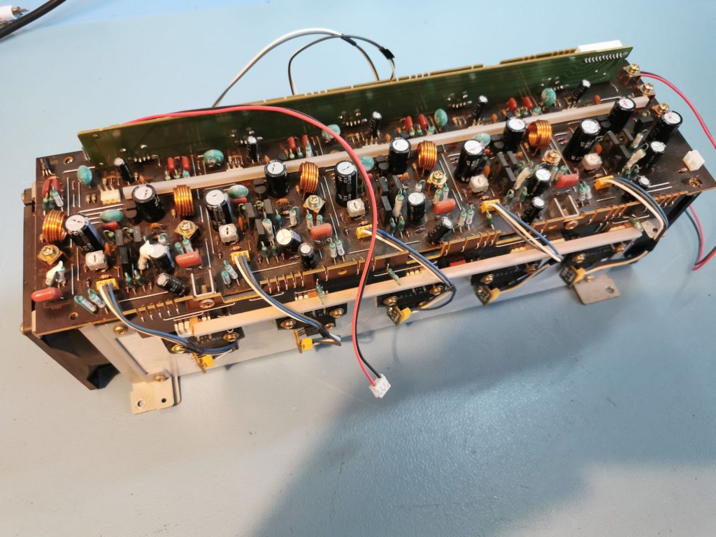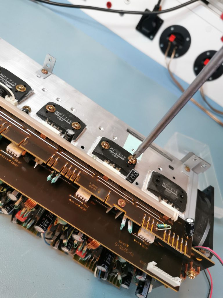 Bleibt also nicht aus – der Endstufenblock muss ausgebaut werden, was in diesem Fall sehr viel Arbeit bedeutet. Hierzu muss der Trafo gelöst werden sowie gefühlt 100 Steckverbindungen gelöst. Ebenso die Spannungsversorgung sowie die Endstufenausgänge müssen durch Schraubklemmen getrennt werden.