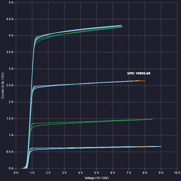 Überraschenderweise passt der hFE-Wert sowie die Messkurve bei den Chinatransistoren relativ gut mit dem original überein, und selbst bei einem höheren Strom gibt es weder Knall noch Rauchzeichen – Was ist denn da los??