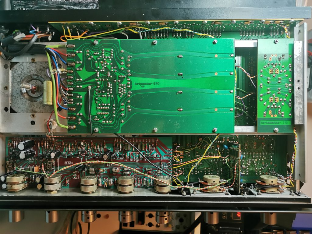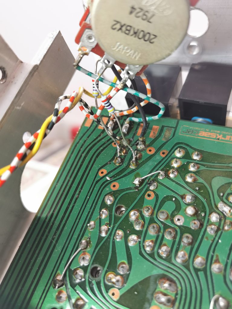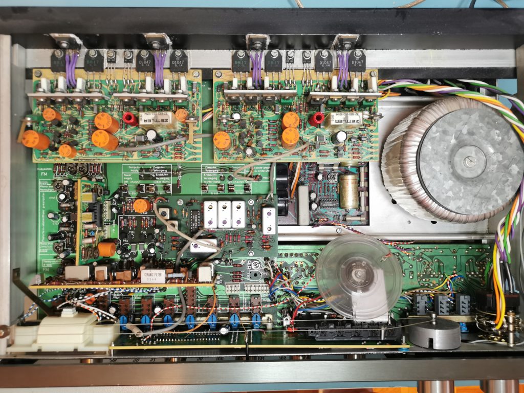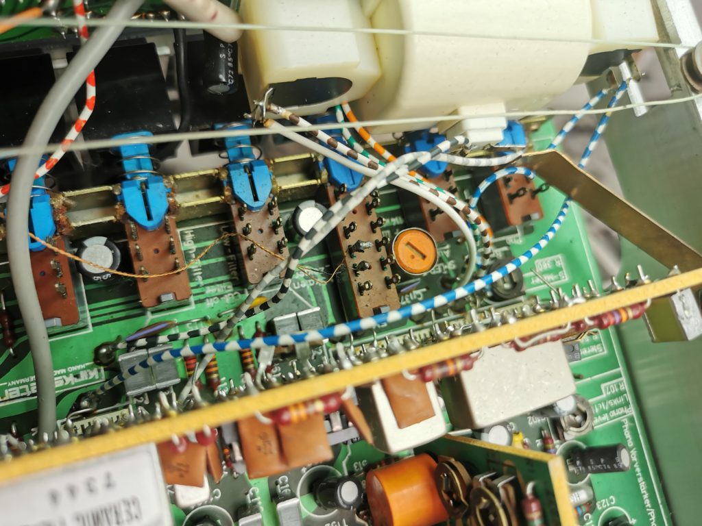 Kontakte von Schalter bzw. Potentiometer wurden teilweise fliegend über Drähte oder Widerstände auf die Platine gelötet. Unendlich viele Kabel und mitten durch geht auch noch der Seilzug der analogen Tunerskala, welcher zusätzlich noch auf ein Potentiometer abgestimmt ist, welches das eigentliche Tuning übernimmt und dann zusätzlich zur analogen Skala auf einem digitalen LED-Anzeigt die eingestellt Frequenz wiedergibt.