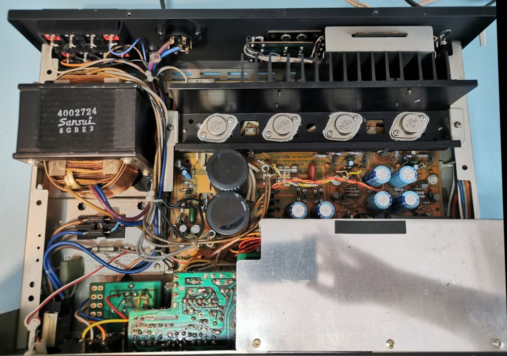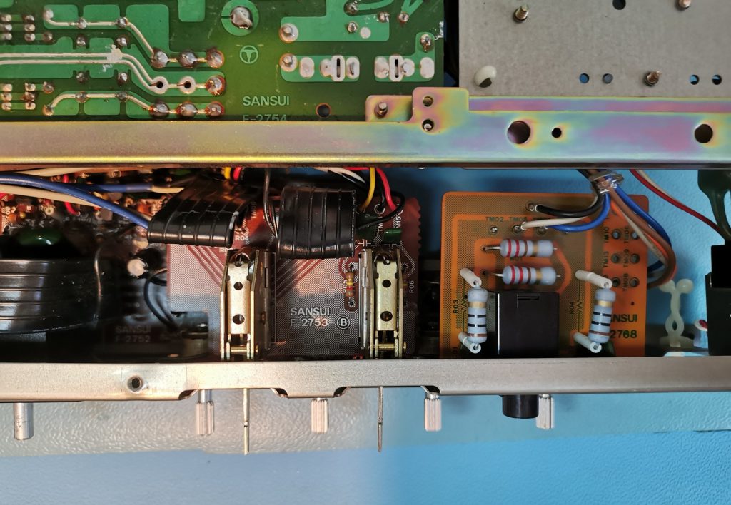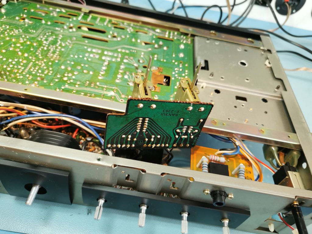 Der Sansui ist recht schlicht und ordentlich aufgebaut. Die Platine mit dem Umschalter ist zwar etwas verzwickt, mit ein bisschen Fummelei kann man sie aber aus dem Rahmen raus nehmen um den Umschalter auszubauen.